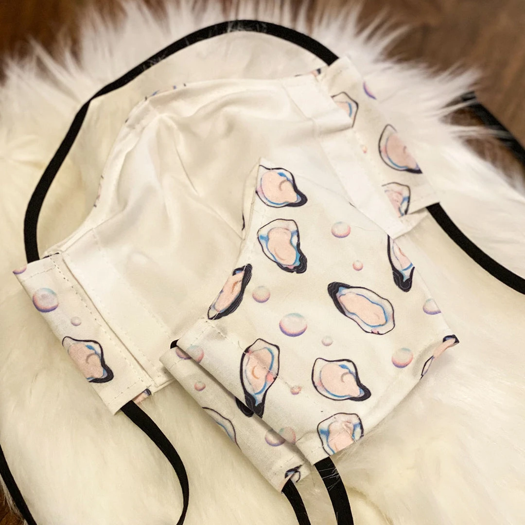 Oysters print illustrated by Ren Strapp; lovingly handmade by Jess Sheeran. Masks feature a filter pocket, are fully adjustable, and tie behind the head. 100% cotton and machine washable.