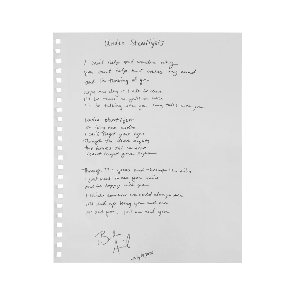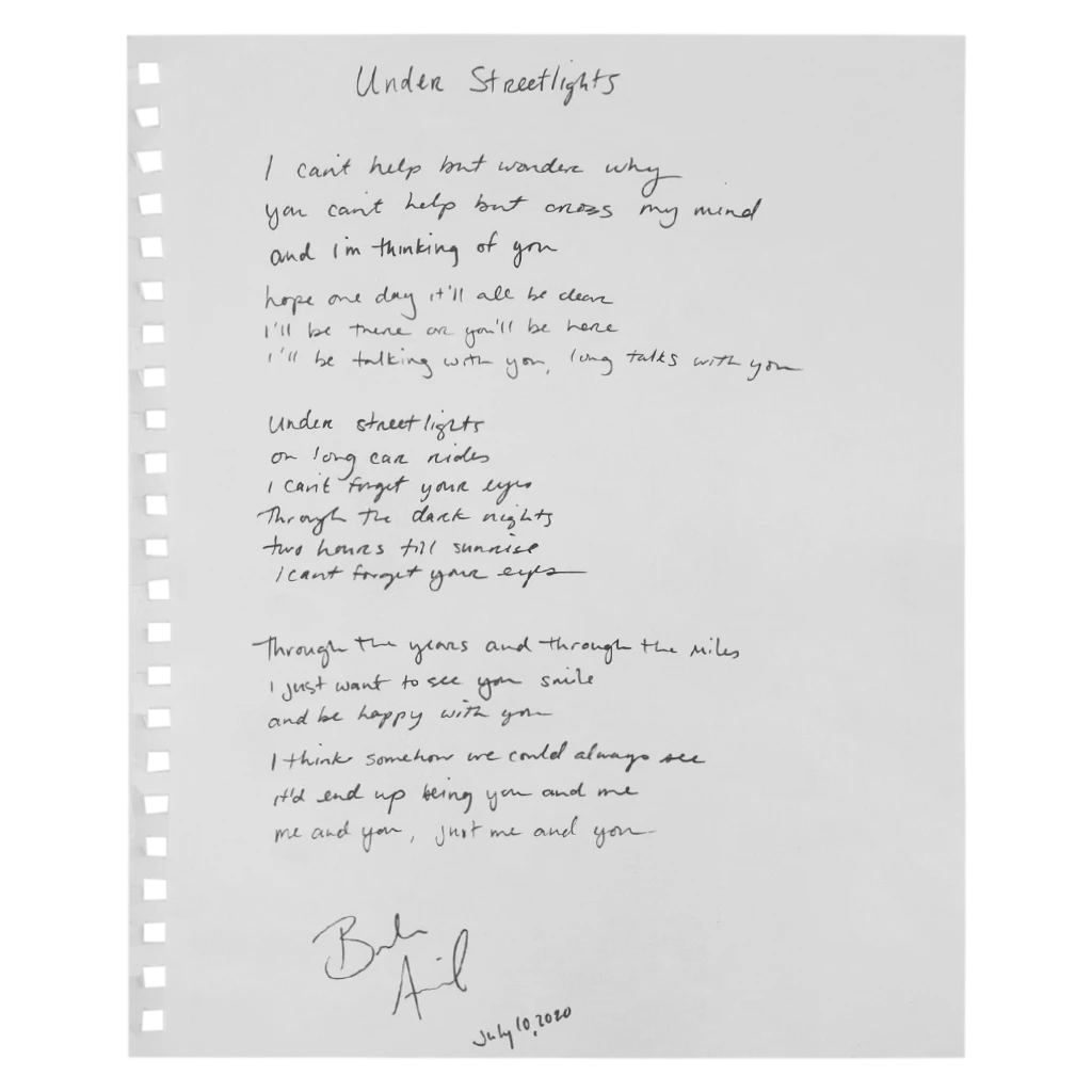 Lyrics handwritten by Brooke on frame-able 9″ x 12″ Art Paper.