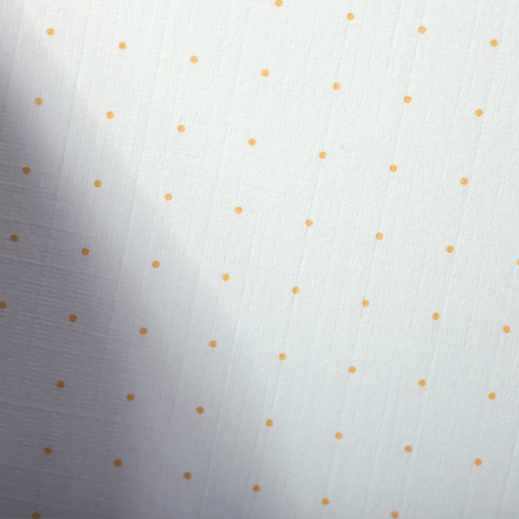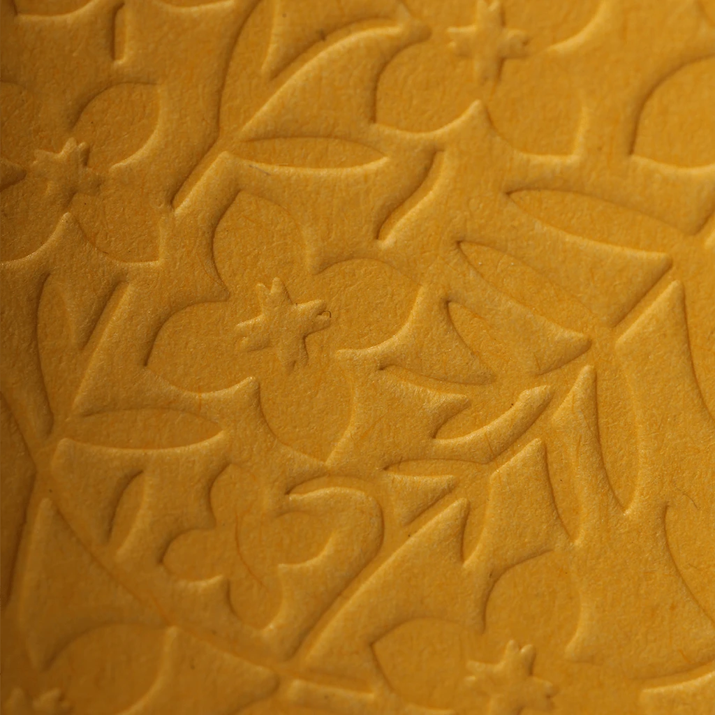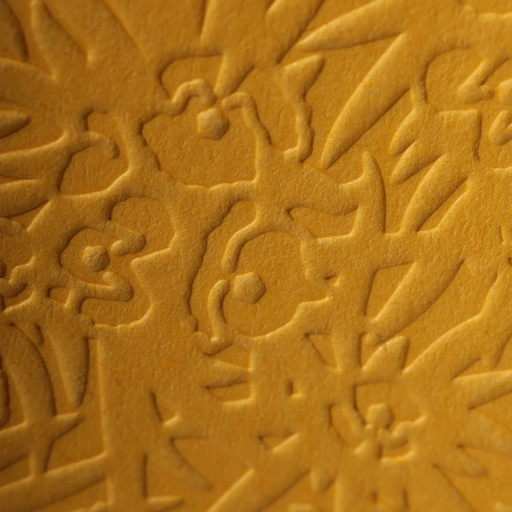 - Innards: Strathmore Cambric 70#T “Ultimate White,” with a fine, 1-color application of “Yellow Crocus” soy-based Saphira ink.