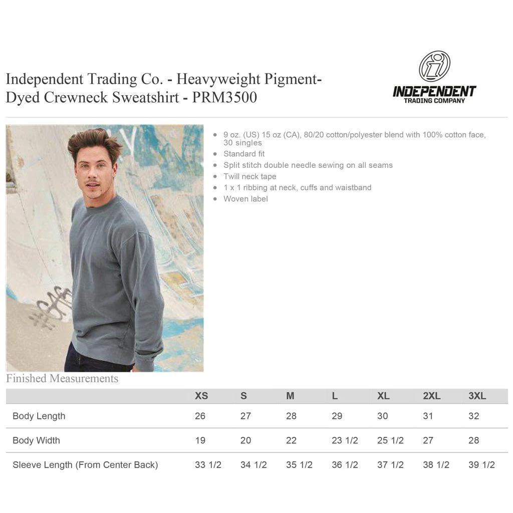 Printed on Independent 80/20 cotton/polyester blend Heavyweight Pigment-Dyed Crewneck Sweatshirt.