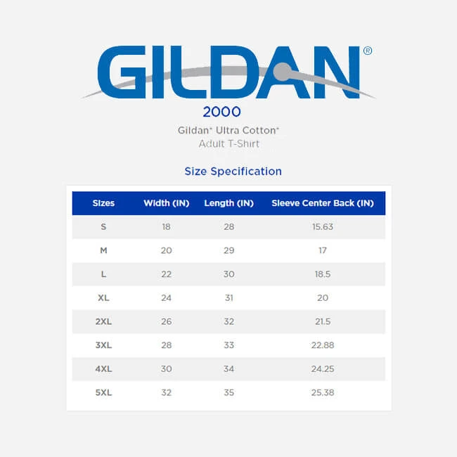 Printed on Gildan 100% preshrunk cotton
