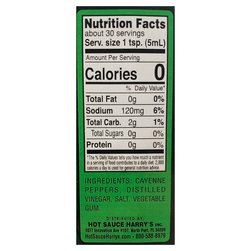 Ingredients: Cayenne Peppers, Distilled Vinegar, Salt, Vegetable Gum.